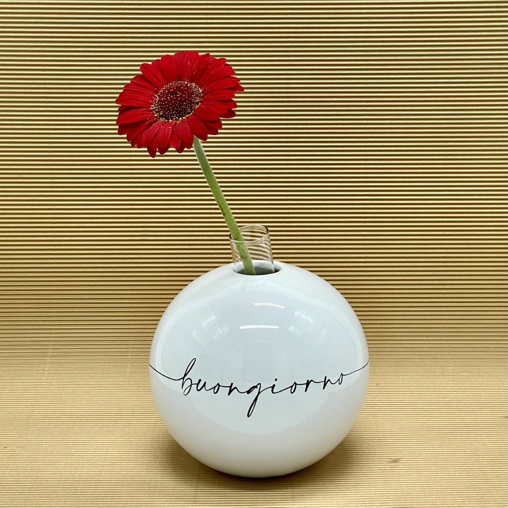 Ampolla in ceramica della linea CALLIGRAFA di FIORDITERRA, la perfezione delle proporzioni della sfera unite alla "bella grafia" della scritta BUONGIORNO, rendono questo vaso indicato a "riempire" ogni ambiente.