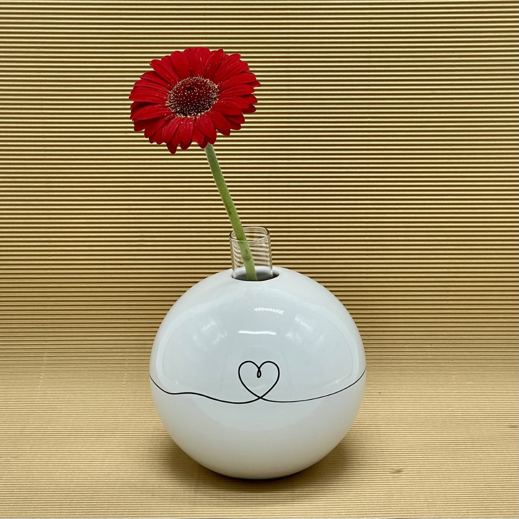 Ampolla in ceramica della linea CALLIGRAFA di FIORDITERRA, la perfezione delle proporzioni della sfera unite alla "bella grafia" un delicato CUORE disegnato, rendono questo vaso indicato a "riempire" ogni ambiente.