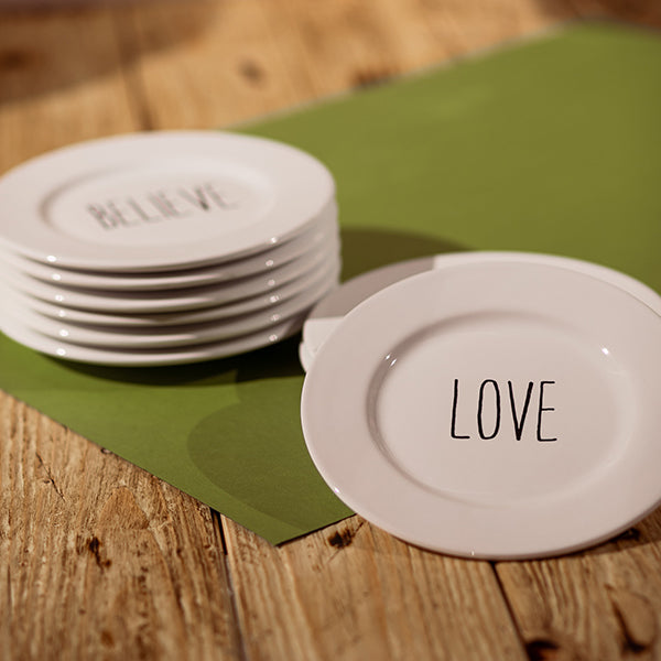 La collezione per la tavola e prima colazione è arricchita da tazze, vassoi, palle di natale, decorate da parole brevi ma di ispirazione. Forme tonde, rettangolari, a cuore molto minimal enfatizzano la parola scritta in un carattere sottile e svolazzante adatta ad ambienti moderni, giovani e originali.