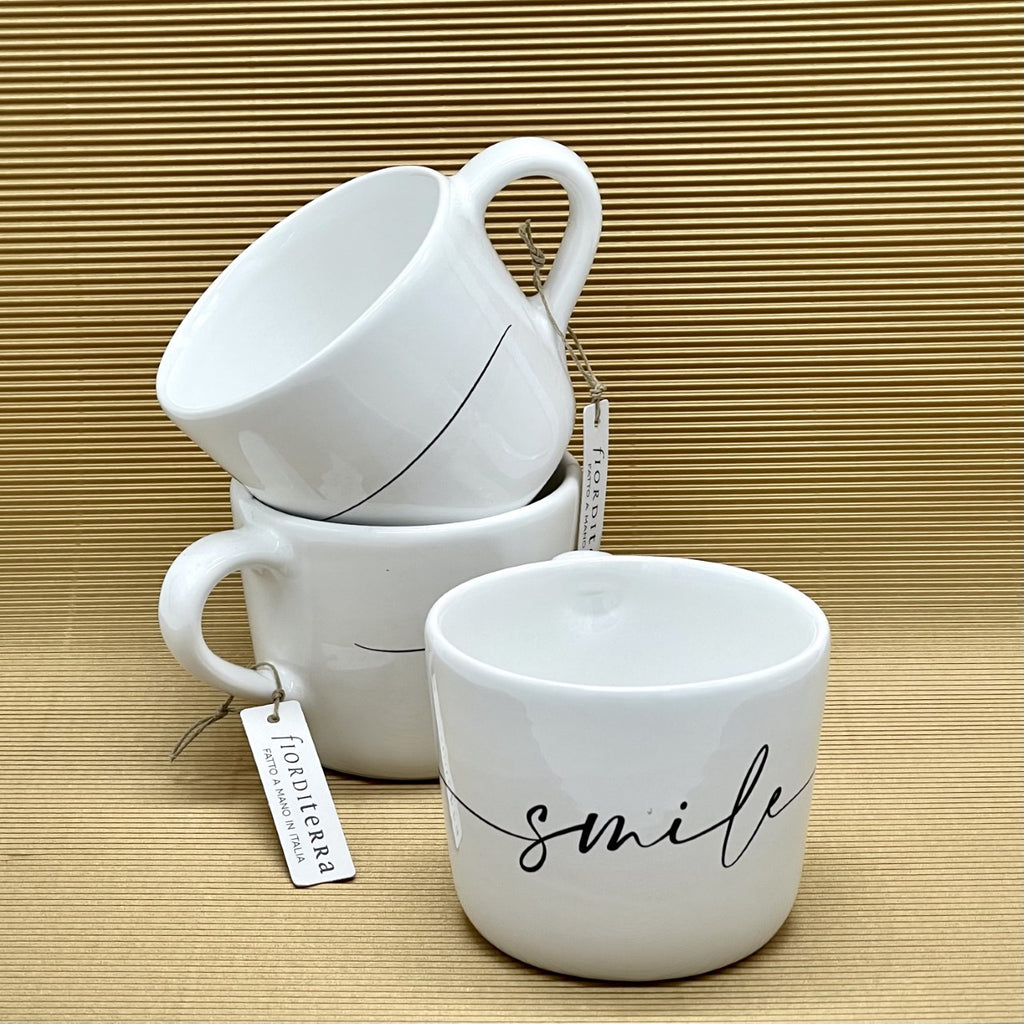 Tazza da colazione in ceramica della linea CALLIGRAFA di FIORDITERRA. La semplicità delle proporzioni unite alla "bella grafia" della scritta SMILE, rendono questa tazza ideale per la tua colazione, per una tisana o per una cioccolata calda!