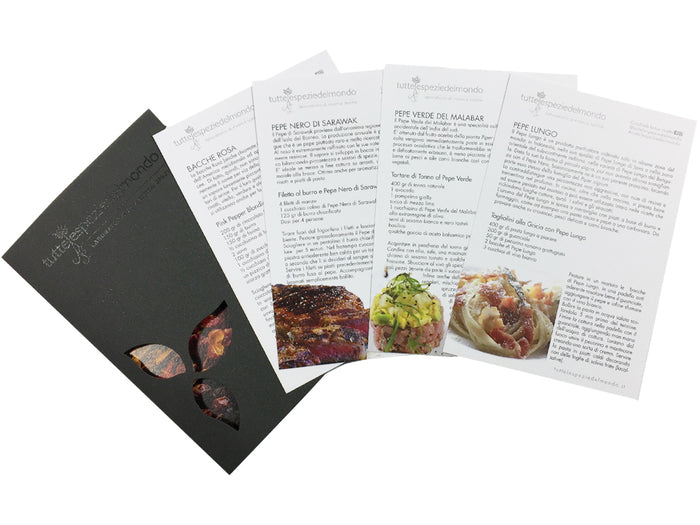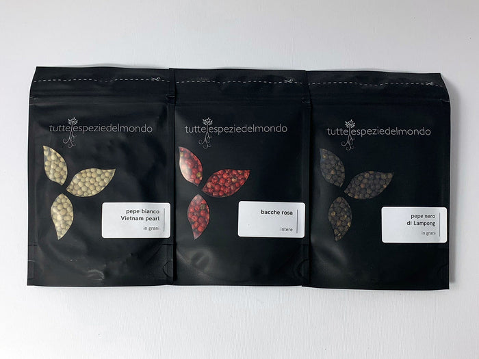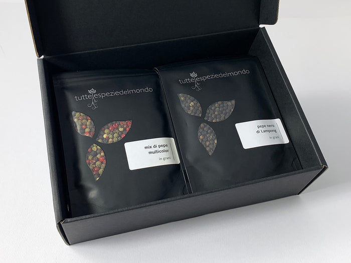 Composizione: Pepe Nero di Lampong 40 gr, Pepe Bianco Vietnam Pearl 40 gr, Pepe Verde Malabar disidratato 30 gr, Pepe Lungo 40 gr, Mix di Pepe Multicolor 40 gr, Bacche Rosa 20 gr