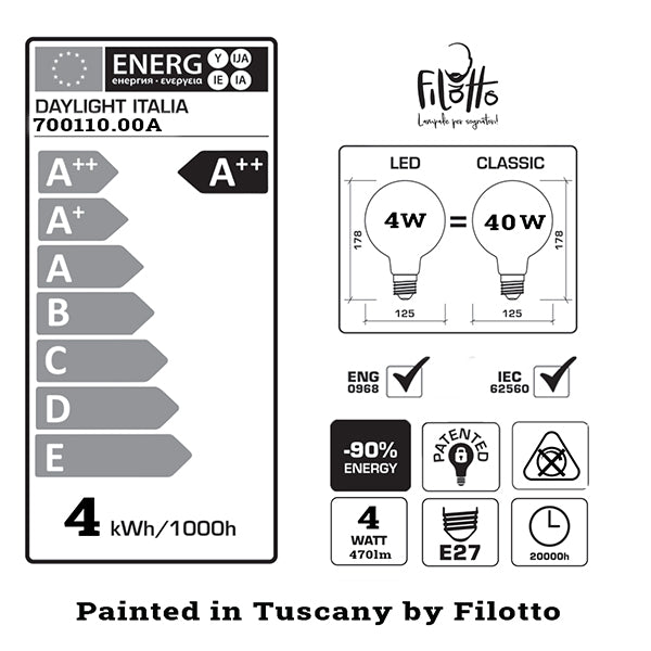 La lampadina Tattoo Lamp è satinata ed adatta sia alla sospensione che alla lampada da tavolo, è led a risparmio energetico con attacco adatto ad ogni portalampada della collezione FILOTTO.