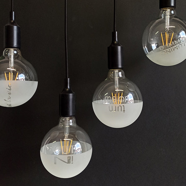 La Tattoo Lamp è la linea di lampadine FILOTTO con vetro schermato da scritte o simboli grafici con il doppio obiettivo di aumentare il confort visivo riducendone o azzerandone l’abbagliamento. Il pallino è un gioco estetico che rende la lampada anche originale.