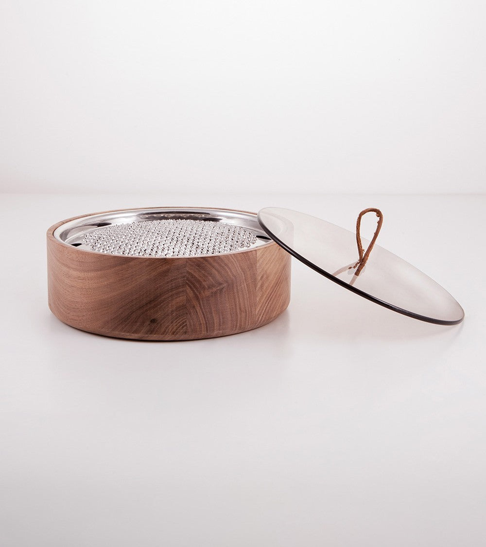 E' una funzionale grattugia di forma circolare, abbinata ad una scatola in legno noce canaletto provvista di un coperchio in vetro temperato con un anello in cuoio come pomolo.