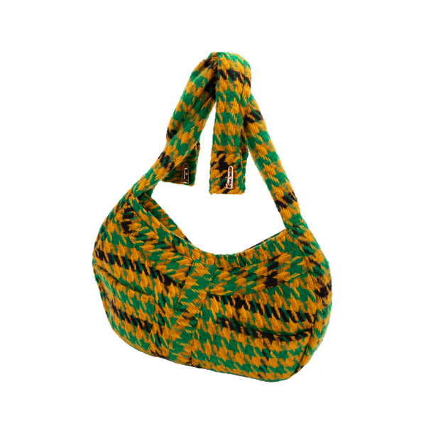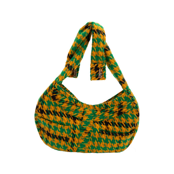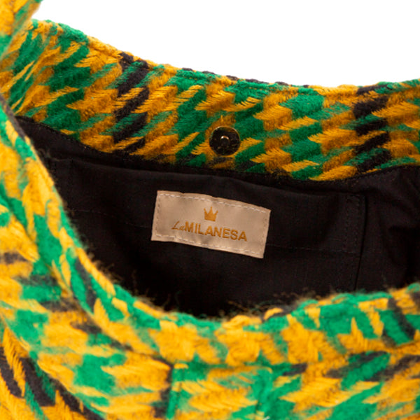 Una spaziosa borsa in tessuto di lana pied-de-poule nei toni del verde, giallo e nero. All'interno uno scomparto unico con taschina a soffietto con logo applicato; la chiusura magnetica è nascosta; ha anche due tasche sul davanti e la tracolla annodabile. L'esterno è in lana l'interno è completamente foderato.