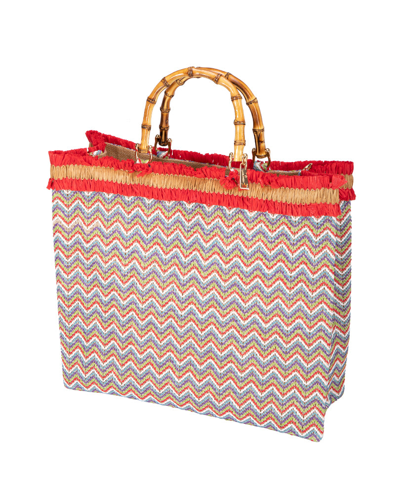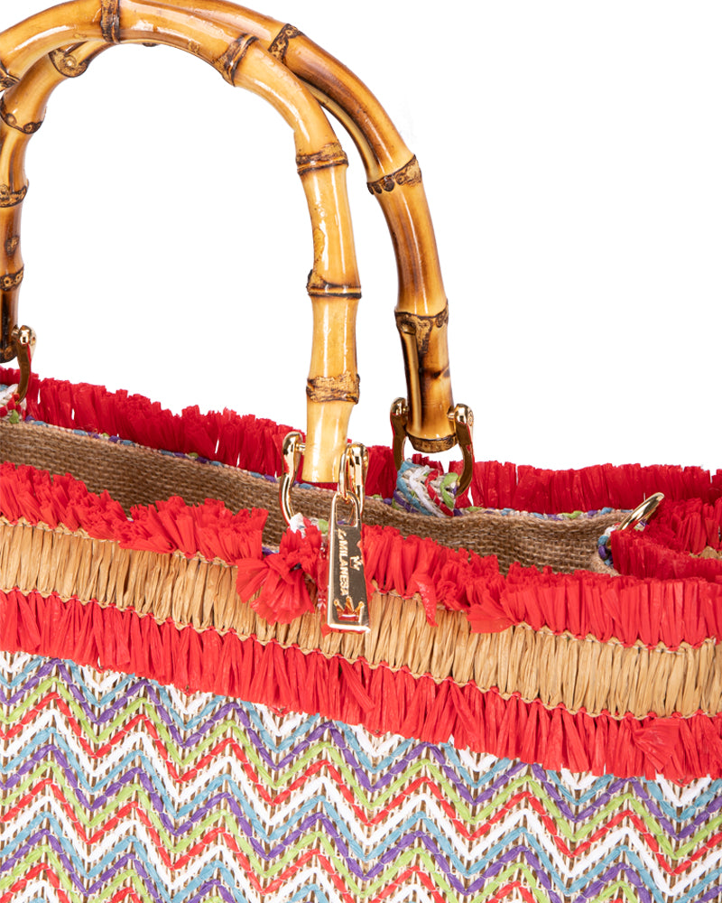 Dedicata a chi ha l’estate negli occhi e nel cuore. La base della borsa è una festa di colori che esplode in un motivo a zig-zag su un tessuto di rafia multicolor.