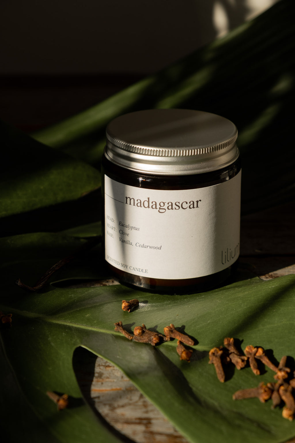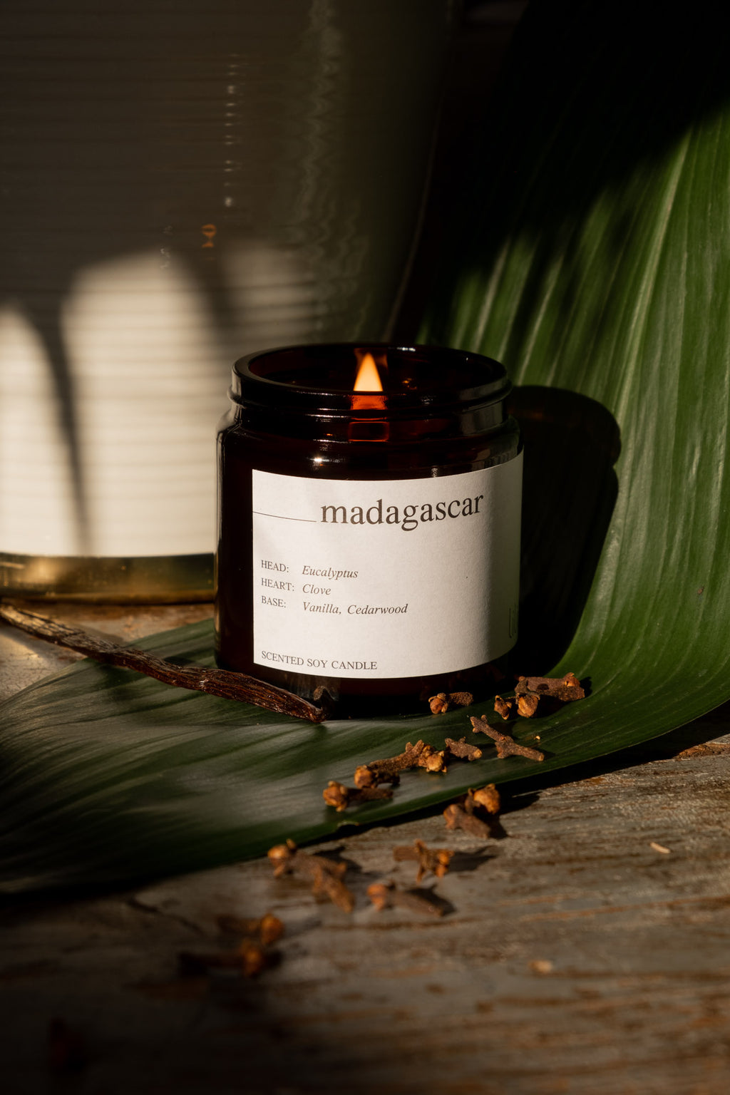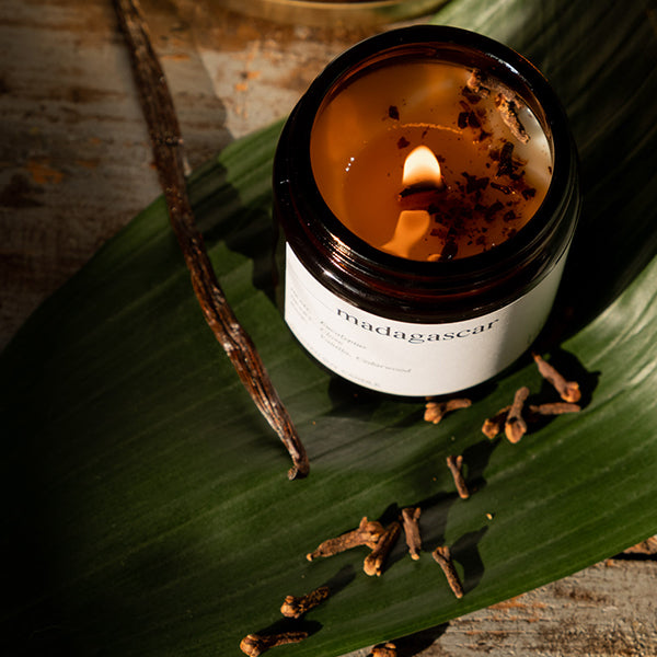 100% cera di soia colata a mano in un elegante vasetto di vetro ambrato con tappo in alluminio, stoppino in legno proveniente da foreste certificate FSC (concesso in licenza da Lumetique Inc.) e oli profumati di alta qualità infusi con oli essenziali.