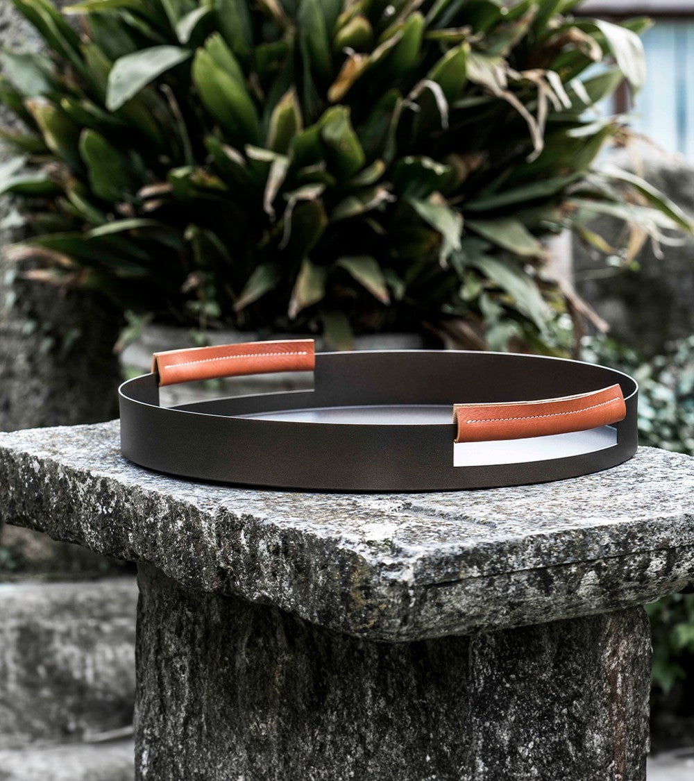 Incredibilmente leggeri e funzionali, la collezione prende ispirazione dal look dei vassoi da bistrot innovandoli con nuovi materiali – alluminio con finitura stone-washed e ferro brunito – inserendo elementi contemporanei in cuoio quali manici e ganci di appensione.