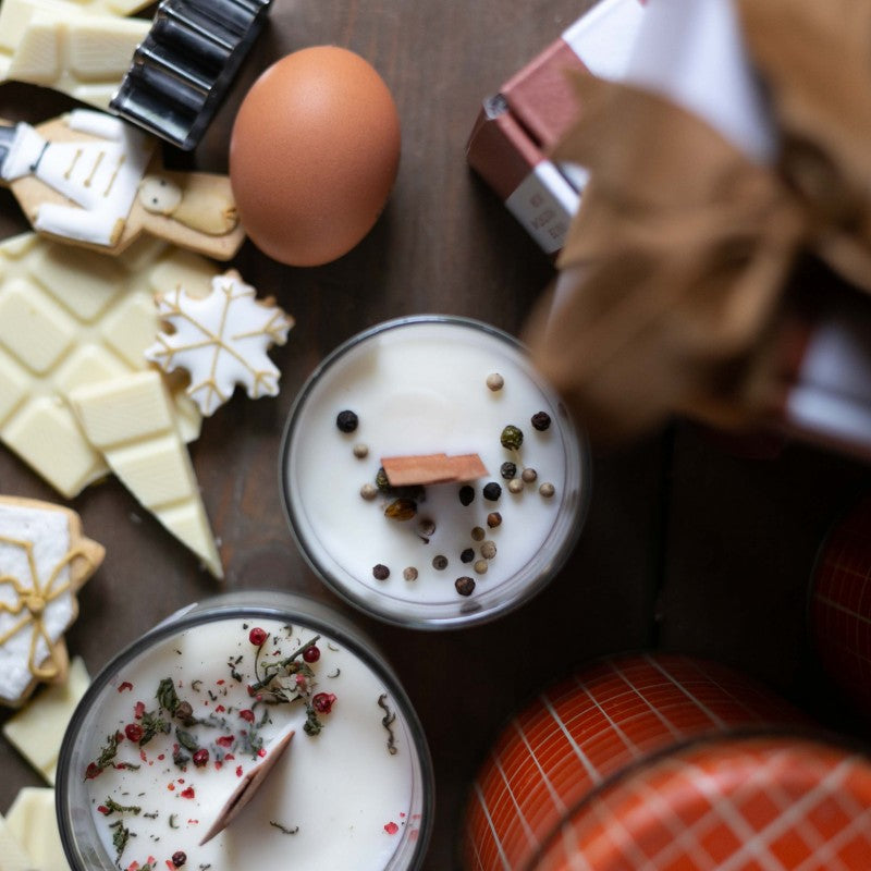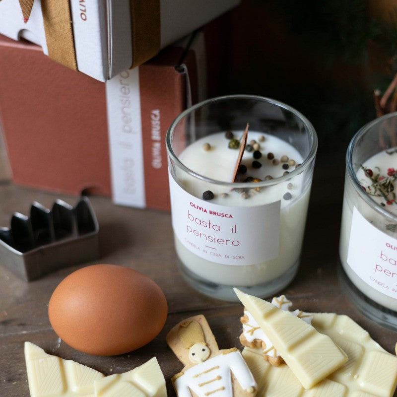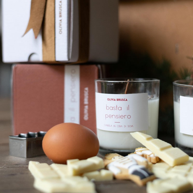 La candela è venduta all'interno di una scatola che contiene uno stampo in acciaio per biscotti, ricetta illustra e QR Code per condividerla.