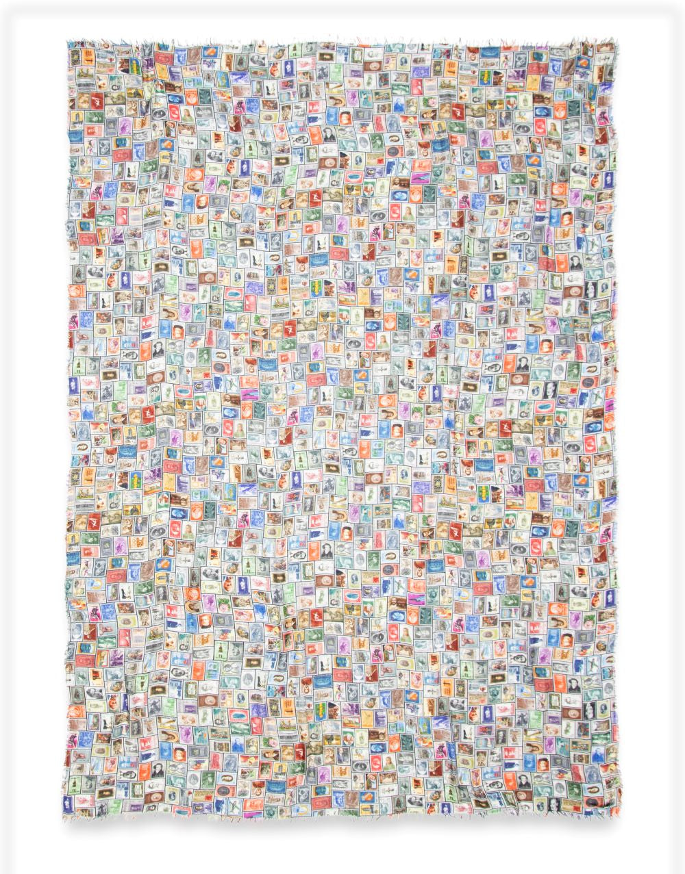 Un'accattivante e coloratissima stampa con francobolli definisce la sciarpa Stamps filata in un fine mix di modal e cashmere.