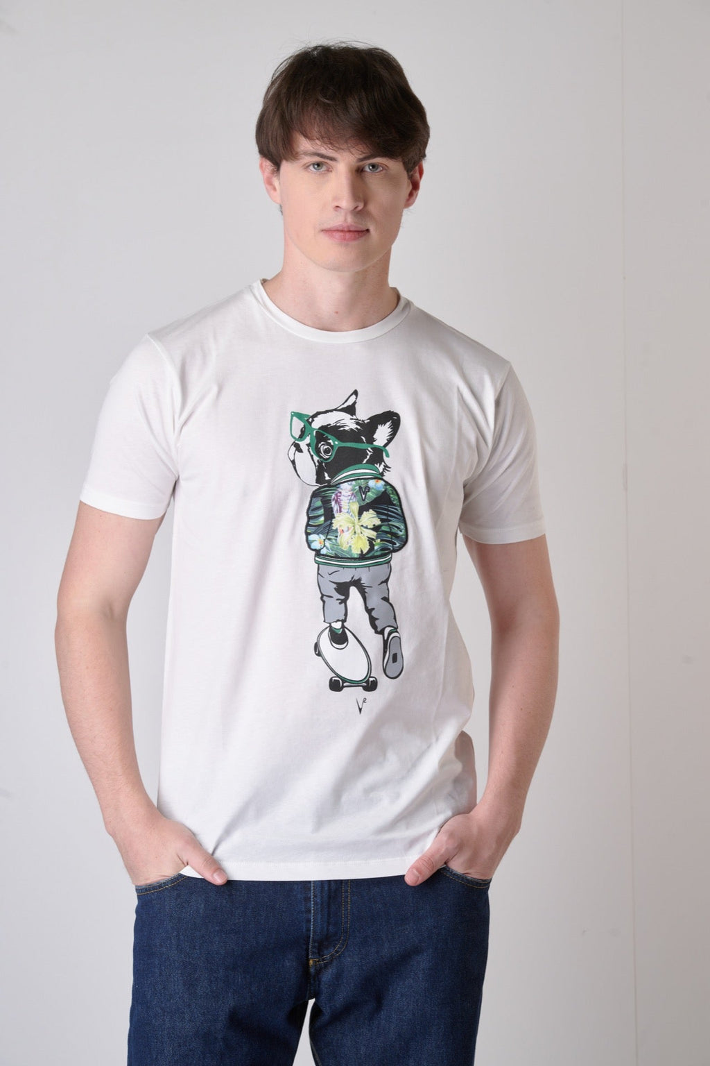 T-SHIRT BIANCA CON STAMPA BULLDOG E INSERTO IN TESSUTO RICAMATO